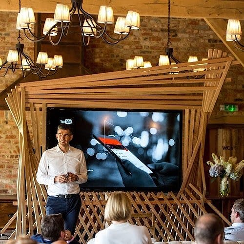 Working with local suppliers we continued the design of the Farmhouse through to the branded elements and experience creation with a stage set constructed from the same timber as the farmhouse roof. Blending natural textures with technology to bring warmth and authenticity to the content over this 2-day summit.